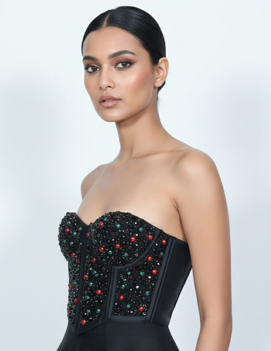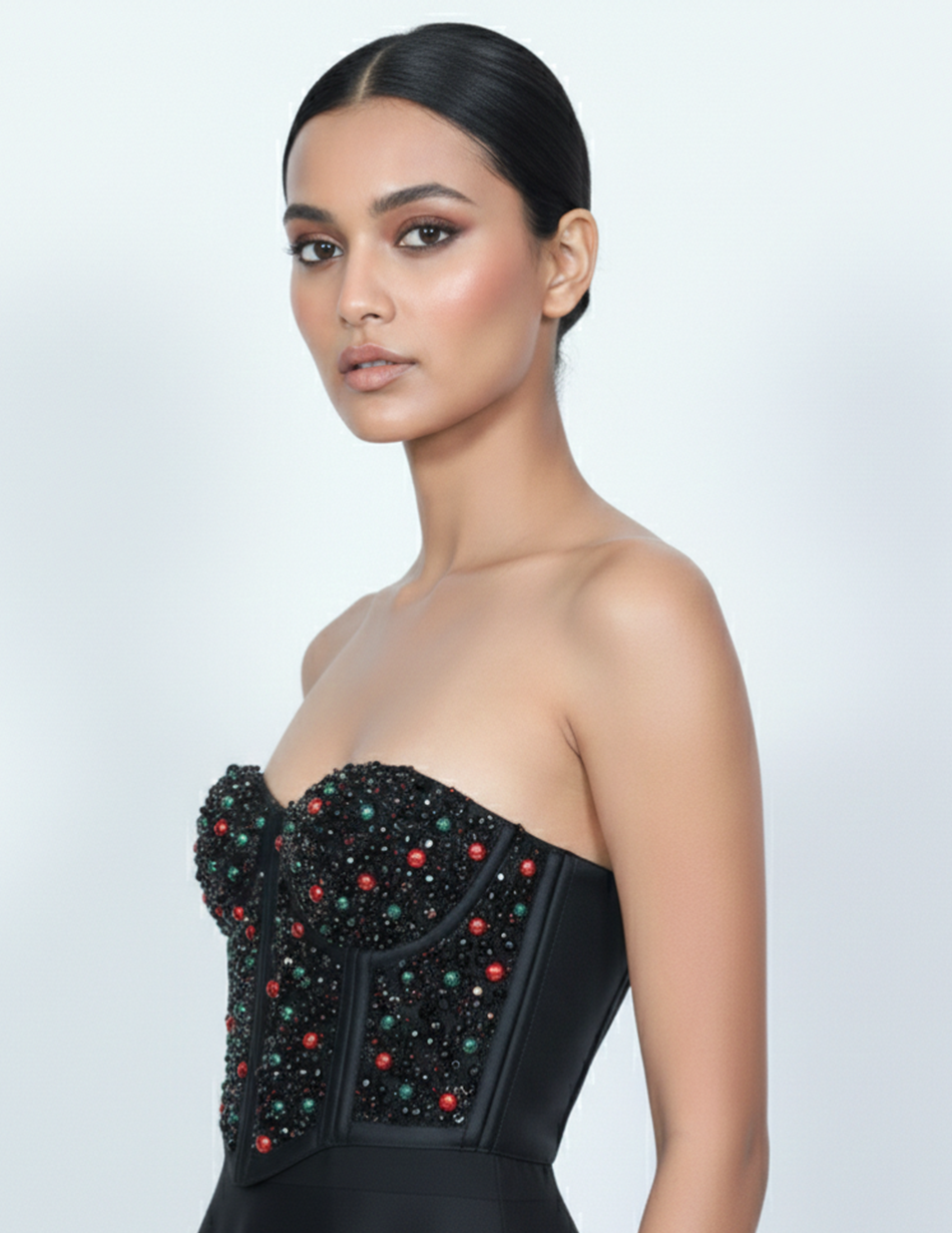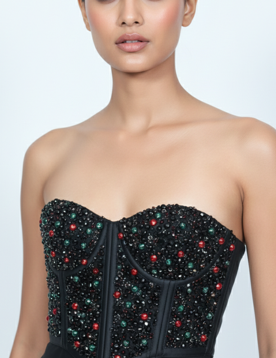 - Embellishment: The bodice is fully encrusted with hand-applied onyx-black seed beads, punctuated by a scattered "confetti" pattern of emerald green and ruby red spherical crystals. This combination creates a textured, multidimensional shimmer that catches the light from every angle.