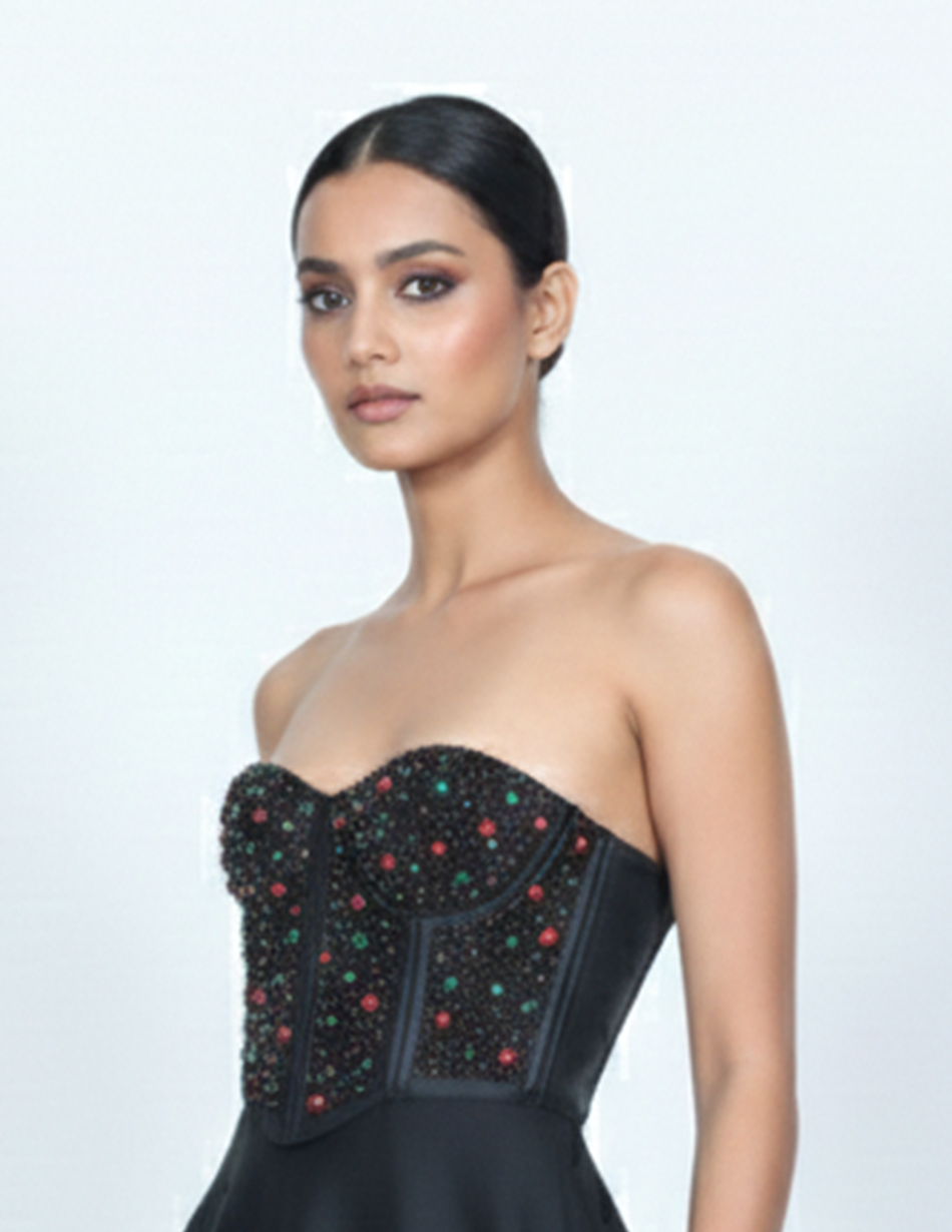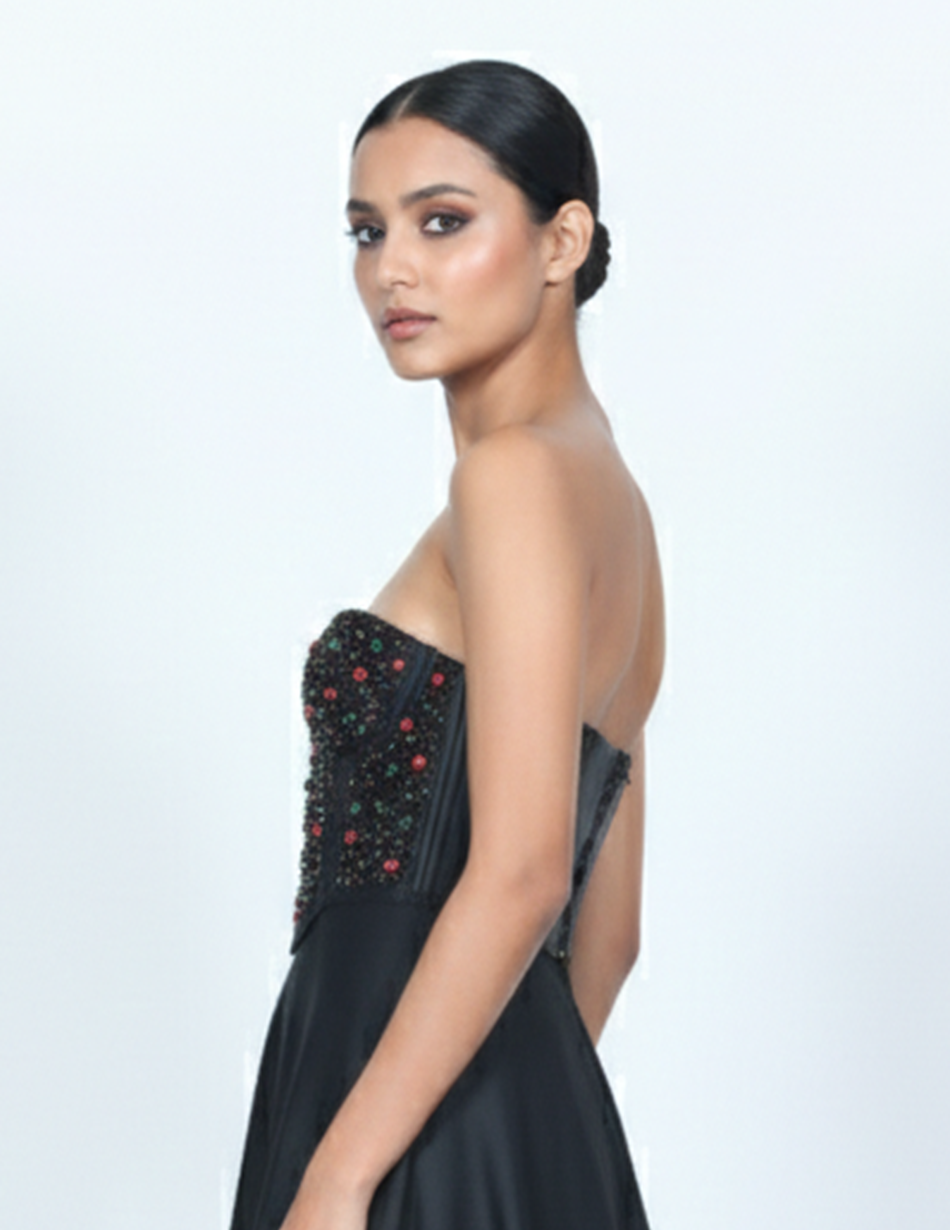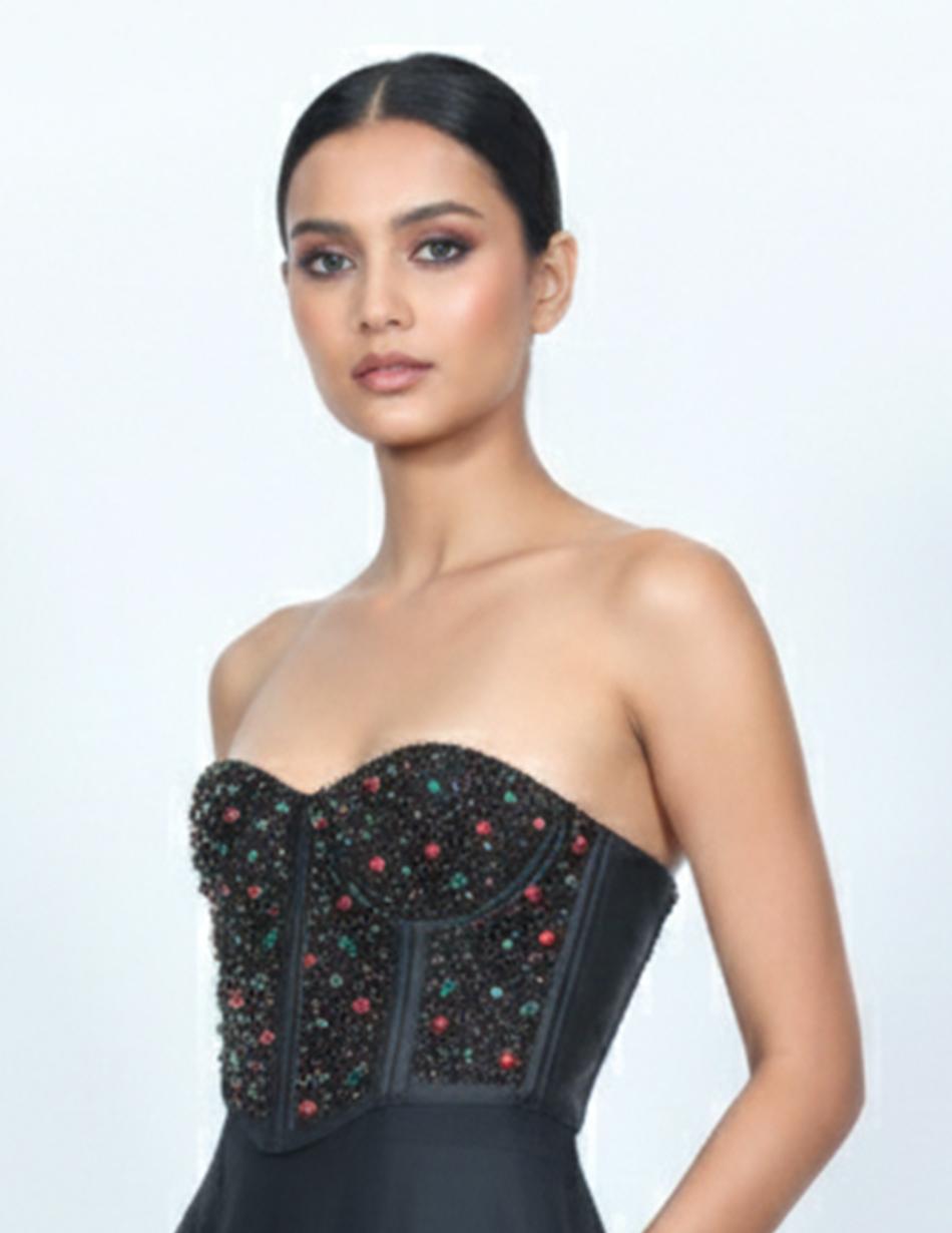 - Embellishment: The bodice is fully encrusted with hand-applied onyx-black seed beads, punctuated by a scattered "confetti" pattern of emerald green and ruby red spherical crystals. This combination creates a textured, multidimensional shimmer that catches the light from every angle.