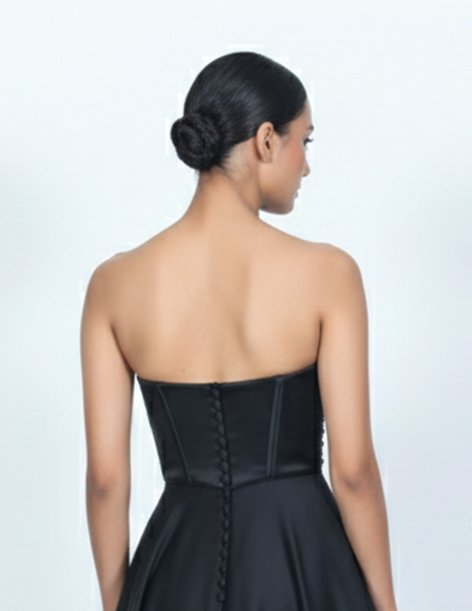 - Design: A sleek, strapless black corset with sweetheart neckline and structured visible vertical boning, meticulously designed to offer a sharp, cinched silhouette.
