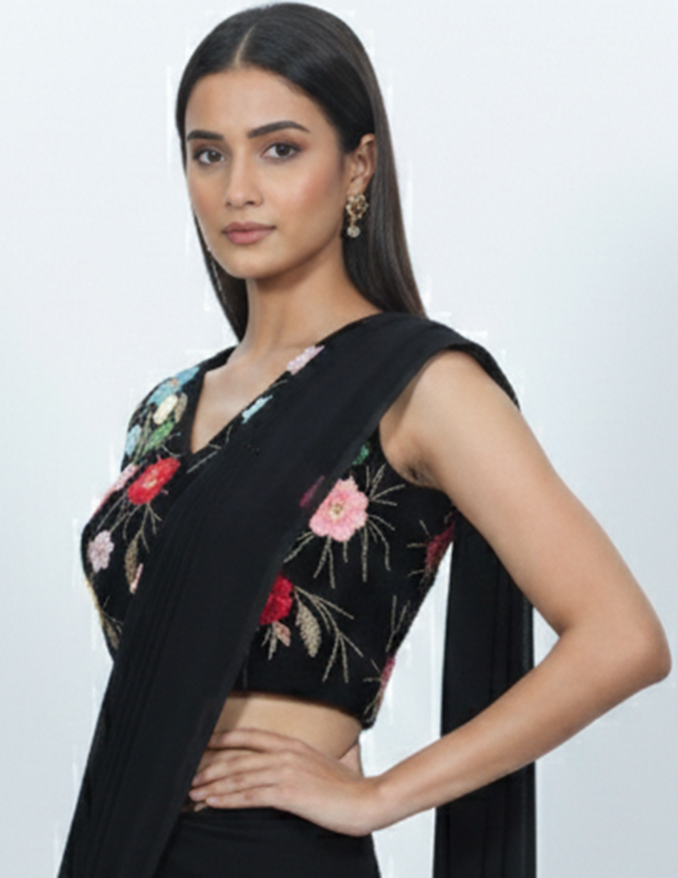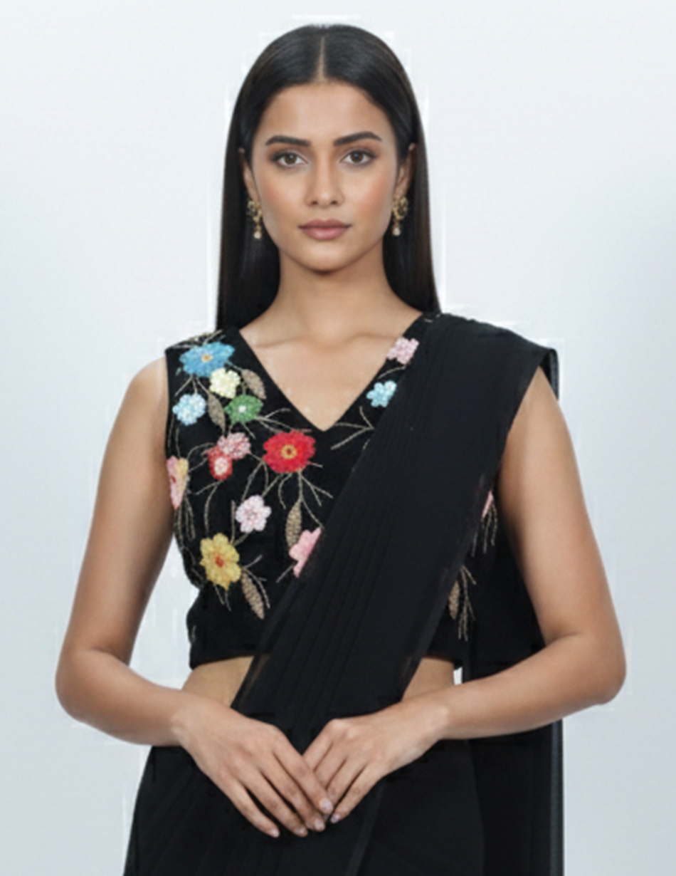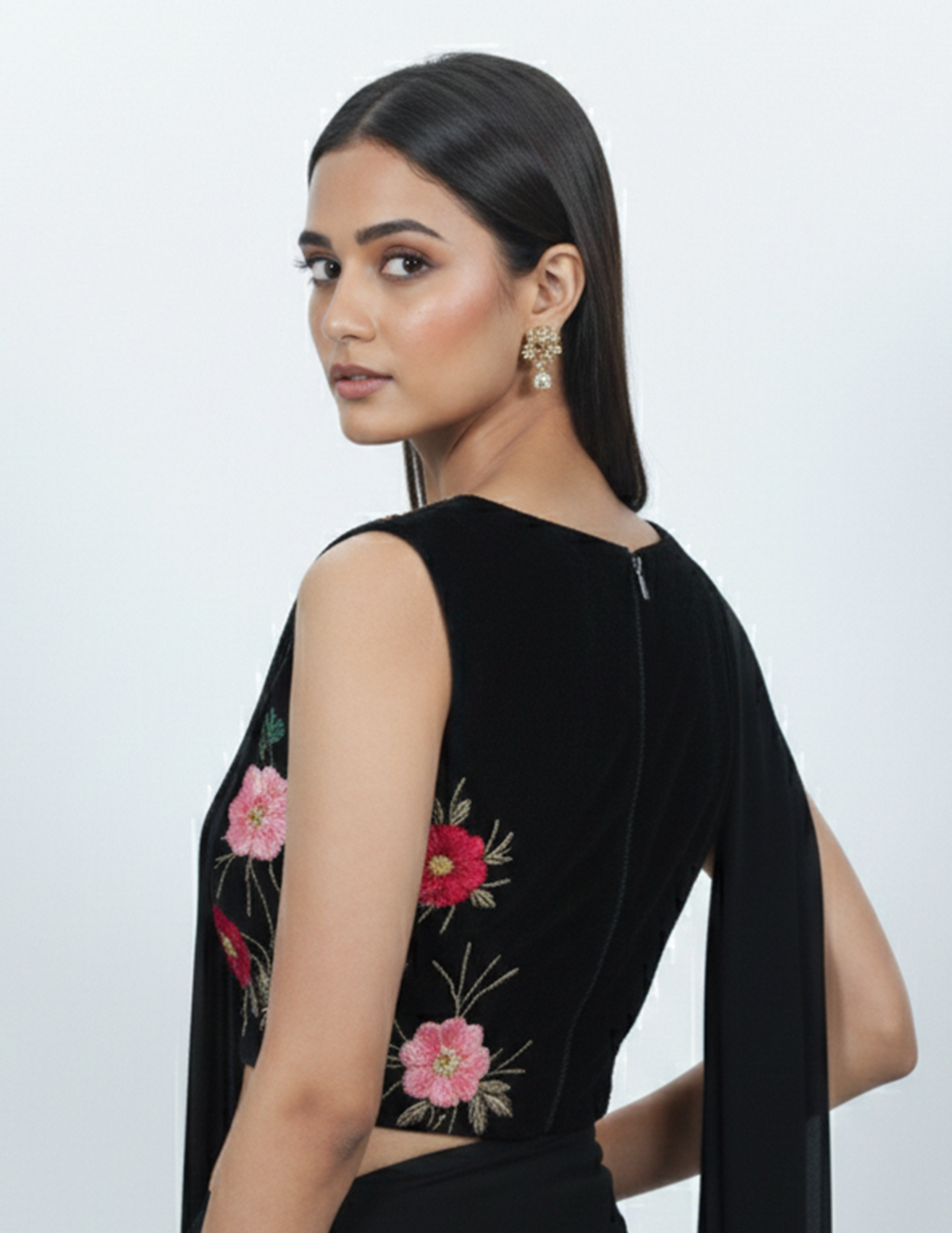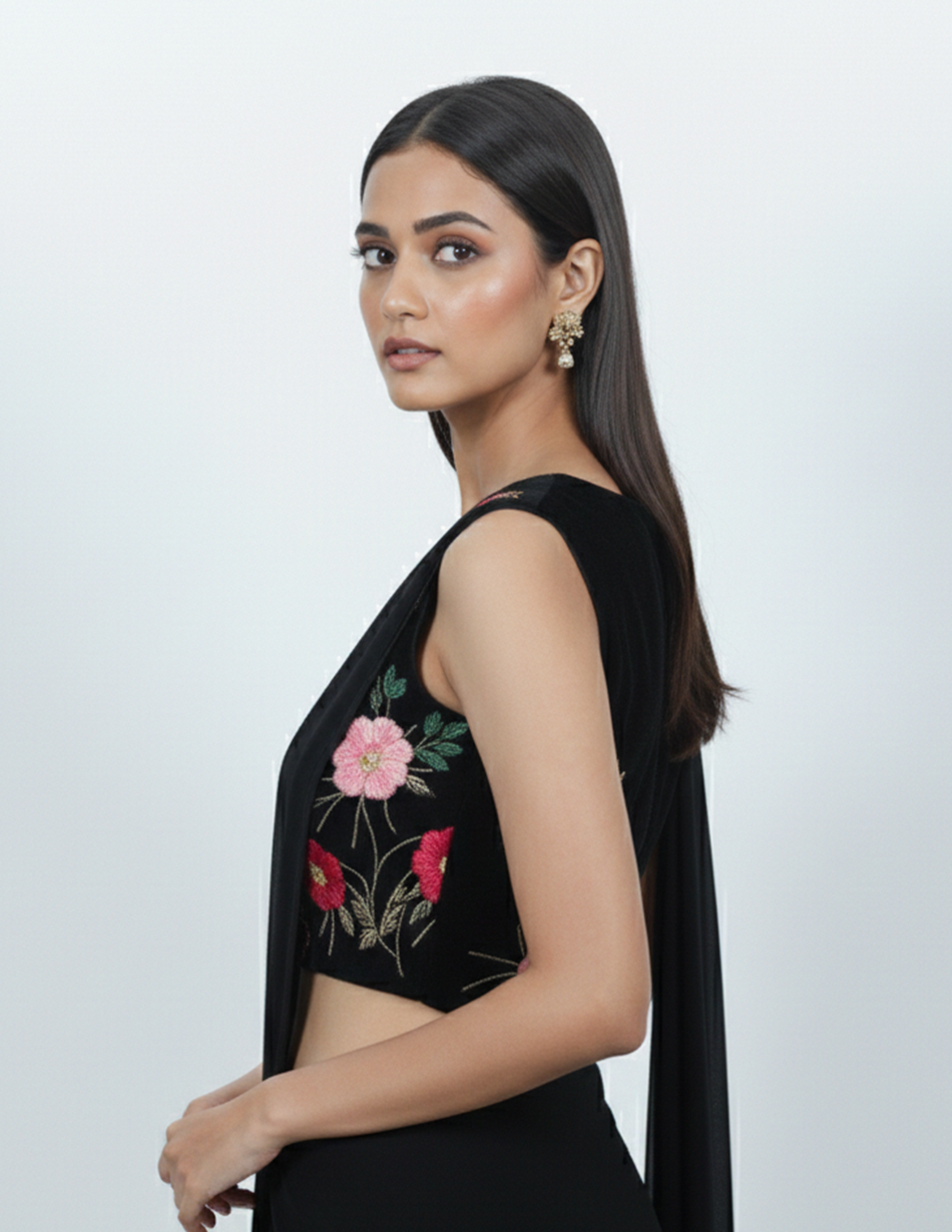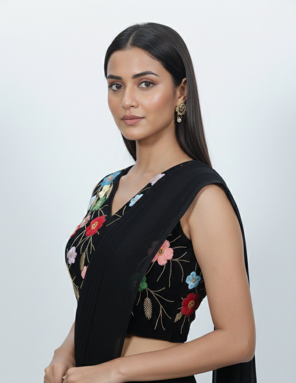 - Embellishment: Multicolour floral thread embroidery that beautifully contrasts against the deep black base.