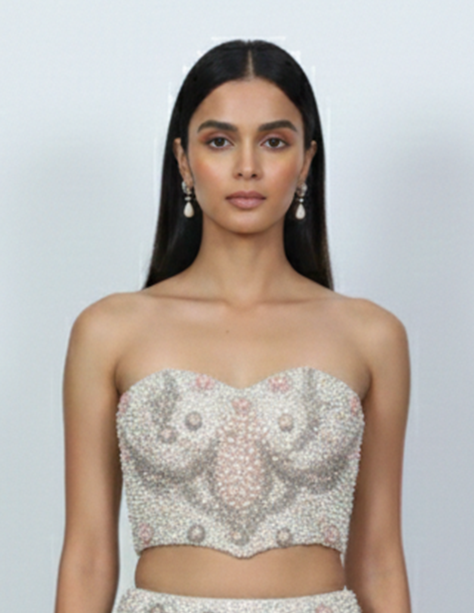 - Embellishment: Fully adorned with intricate pearl, bead, and sequin embroidery arranged in delicate floral and ornamental patterns.